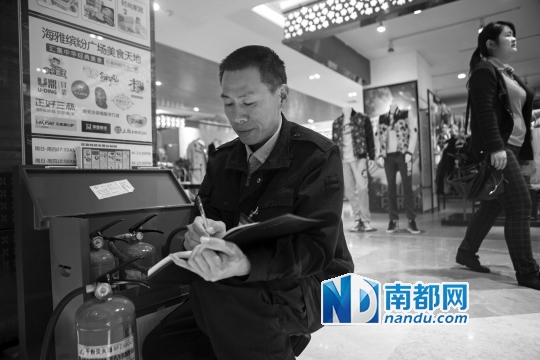昨日是胡文金上班第一天,南都记者在南山海雅百货商场内见到了正在工作的胡文金,记者在现场看到,胡文金对于商场内各个消防设施的位置、使用方式、使用情况都非常熟悉,据该商场杨经理介绍,胡文金时间观念非常强,个人习惯很好,非常适合在商场环境工作,具有丰富的安保经验,“本来给他安排了晚班,但他早早就过来了”。