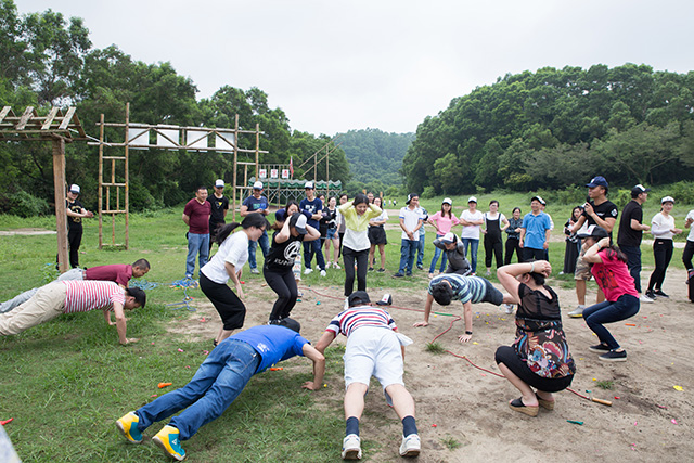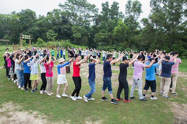 一个小时之后,大部队到达了九龙山生态园,一下车便被绵延不绝的群山、树林和草坪包围,雨后的空气格外清新,大家的心情也十分轻快。负责拓展的小徐教练很快将队伍进行了整顿,“桃花朵朵开”、“手指操”等一个又一个有趣的热身项目迅速消除了陌生同事之间的隔阂,把大家的状态点燃,投入到热情澎湃的集体挑战之中。最有挑战性的环节叫做 “挑战160秒”,每支队伍需要先后完成10人连续跳绳5次不间断、男生俯卧撑和女生蹲起、吹爆气球、团队协作绕口令的项目,用时最短的队伍获胜,大家在这个挑战环节表现出了超强的团队意识和协作精神,有的队伍配合默契最终获得奖励,有的队伍虽然不够协调,但没有一丝懈怠和敷衍,坚持完成比赛,也有很多逗趣的瞬间惹得全场哈哈大笑。两个多小时的拓展训练很快过去,队员们也来到野炊区开始了农家乐午餐的制作,还未等人员全部落座,大家就按照预先的分组积极投入到野炊环节中,只见队员们分工有序、紧密配合,有的去杀鸡,有的去捉鱼,有的去拾柴,有的去洗菜,不一会儿就响起了锅碗协奏曲,飘起了各种菜香。平日里严肃认真的同事们原来私下里都是烹饪好手,许多队伍的大厨都是男同事,他们做起菜品来丝毫不输家庭主妇们,土豆焖鸡、豆腐炖鱼、凉拌黄瓜、红烧鸭肉……一道道好菜上桌,饥肠辘辘的大家也开始享受集体的劳动成果。午饭结束后大家便开始自由活动,三五一群去划船、唱歌、睡吊床、登山漫步、打扑克、骑单车……休闲的下午让大家放松了心情,也消除了疲惫。