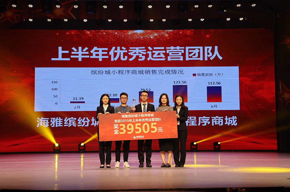 大数据发展时代,信息化、智能化经营尤为重要,海雅商业紧跟时代脚步,于2019年全面开发上线了线上商城小程序,为扩大销售面开拓了新的平台。其中,海雅缤纷城小程序商城自今年2月13日上线以来,用户达四万多名,系统页面点击量一百多万,大大提升了海雅商业的核心竞争力,也当之无愧地荣获了海雅商业小程序商城优秀运营团队。海雅南城店总经理朱素丹为该团队颁奖。