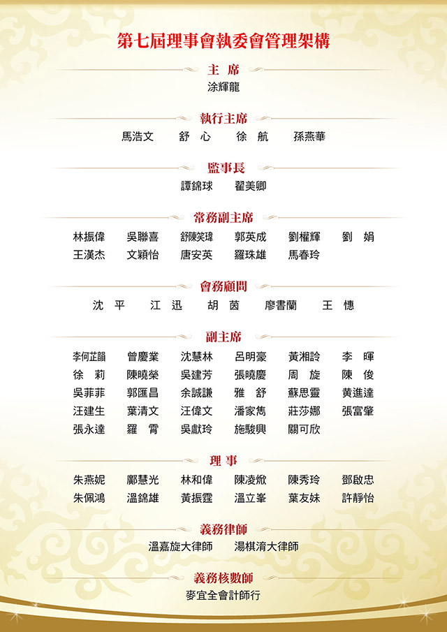 经会员一致通过,选出新一届理事会领导架构:全国政协委员、海雅集团董事局主席涂辉龙博士荣膺第七届理事会执委会主席;上届执行会长、全国政协委员马浩文博士继续荣任新一届执行主席,新任执行主席有:全国政协委员、金澳集团董事局主席舒心博士,清华大学名誉校董、鹏瑞集团董事局主席徐航博士,香港青少年美育之星会长孙燕华女士;上一届会长、全国政协常委谭锦球博士为永远名誉会长兼监事长,上一届主席、全国政协委员翟美卿女士为永远名誉会长兼监事长。
