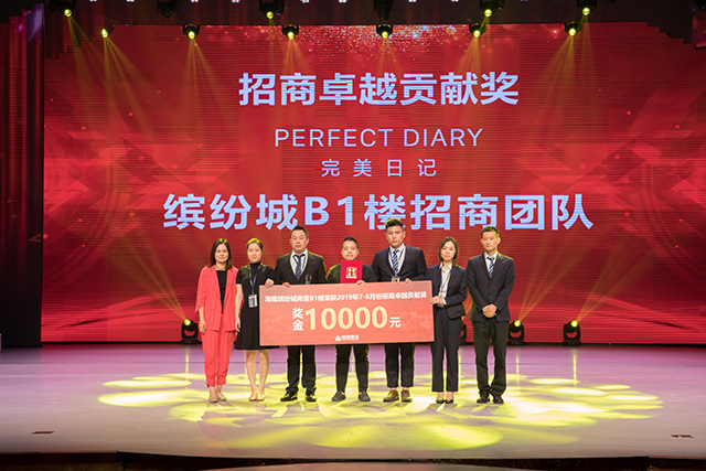 商业的成功离不开好的品牌以及招商团队的共同努力,两者之间是相辅相成的。此次海雅缤纷城负一楼在经过认真的市场调研,精细的品牌组合分析之后,精准引入的国货之光——完美日记。完美日记为中国年轻女性开发了一系列高品质的彩妆产品,彩妆权限产品超过500款的SKU。而此次的7-8月招商卓越贡献也花落于海雅缤纷城负一楼,并由南城店总经理朱素丹为获奖团队颁发了证书、奖杯与30000元奖金及合影留念。