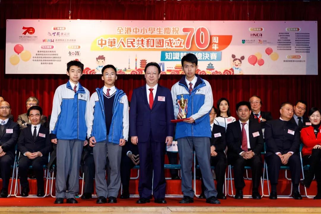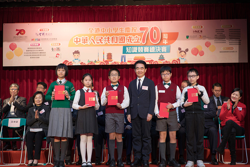 12月13日下午,香港政务司司长张建宗,中央人民政府驻港联络办副主任谭铁牛,全国人大常委谭耀宗,全国政协委员、海雅集团董事局主席涂辉龙等嘉宾出席主礼全港中小学生“庆祝中华人民共和国成立70周年”知识竞赛颁奖礼,并为获奖学生颁奖。
