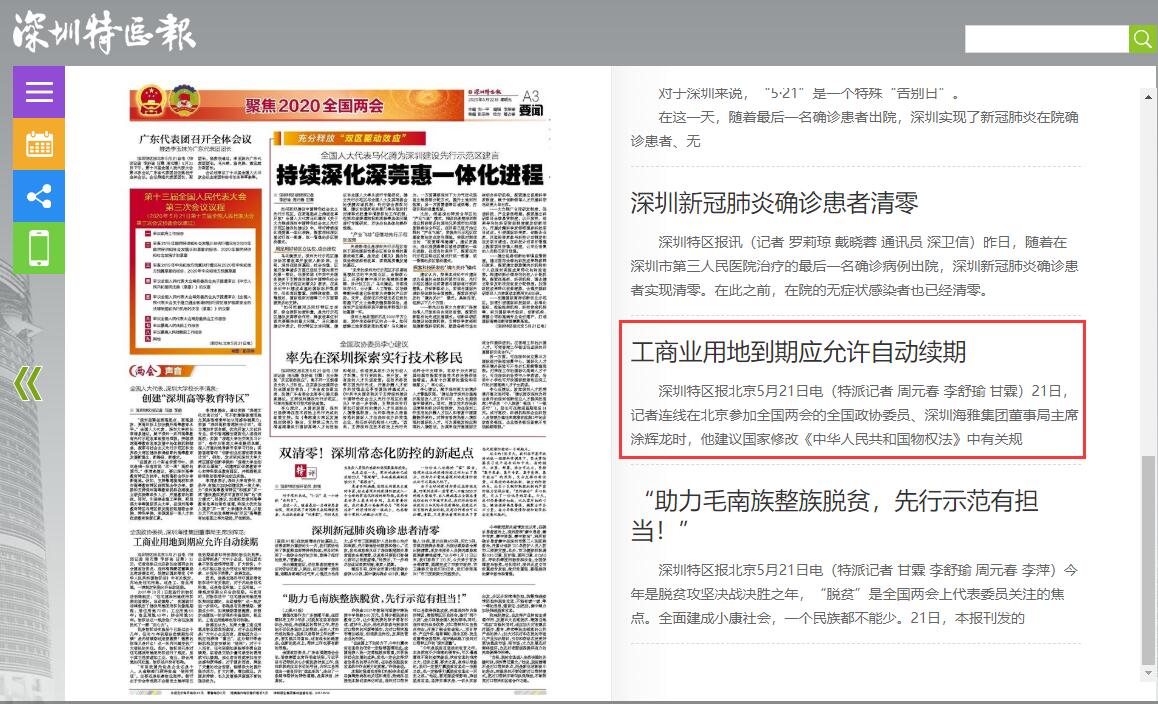 21日,深圳特区报记者连线在北京参加全国两会的全国政协委员、深圳海雅集团董事局主席涂辉龙时,他建议国家修改《中华人民共和国物权法》中有关规定,无论是住宅用地,还是工、商业用地,一律规定到期允许自动延期。