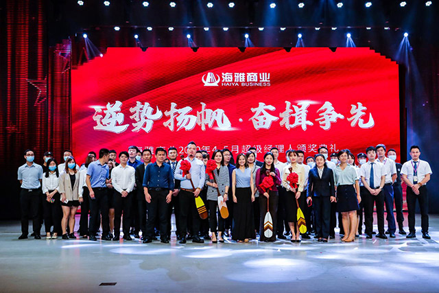在颁奖典礼开始之前,在主持人激情昂扬的介绍下,我们通过一个小视频,从抗疫篇、企划活动篇、经营篇、员工风采篇等四个篇章一起回顾了海雅商业四个项目团队2020年不平凡的开端:面对疫情,迅速反应、360°消杀、商场出入口设测温岗、增设免洗消毒洗手液,保障每一位员工、顾客的安全;同时,精彩纷呈的企划活动也纷至沓来,海雅缤纷城的“爱的声音魔力”、海雅缤纷广场的“端午粽子DIY、东莞片区海雅超级会员日等等,每场活动都带来了客流量及销售的提升;经营上更是迎难而上,主动出击,升级线上商城小程序,直播选货、线上秒杀等创新玩法,给顾客带来不一样的购物体验;面对外部环境的挑战,公司苦练内功、夯实基础,通过培训等方式提高员工综合能力。2020年是充满挑战的一年,但我们相信,全体员工戮力同心、不畏艰难,必能披荆斩棘,勇往直前……