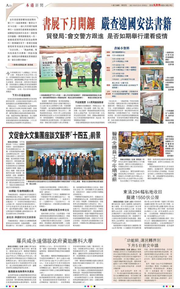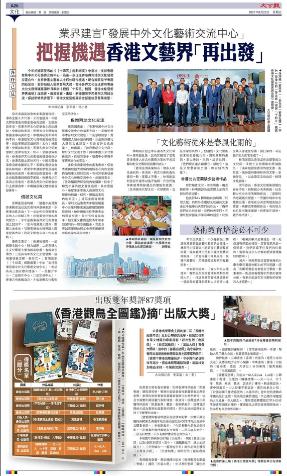 今年初国家发布的《十四五规划纲要》中提出,支持香港发展中外文化艺术交流中心。为进一步促进香港与内地的文化艺术交流合作,支持香港文艺界人士抓住时代机遇,配合国家给予香港的新定位,更好地融入国家发展大局,香港各界文化促进会和香港大公文汇传媒集团昨日举办《把握「十四五」机遇——香港文化艺术界再出发》座谈会,透过书画、出版、新媒体等不同界别之间的交流,探讨新时代背景下,香港文化艺术界的全新定位及发展前景。