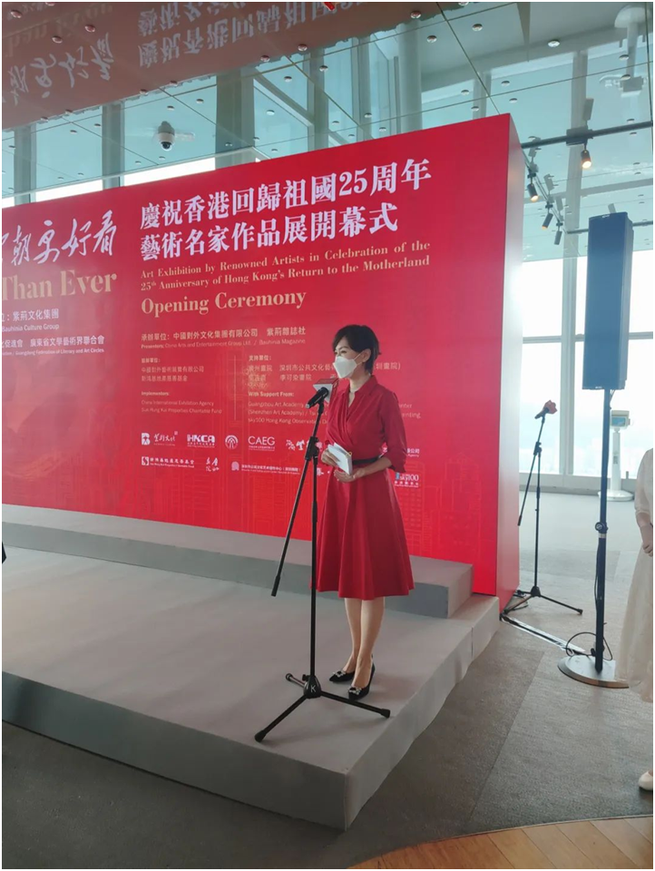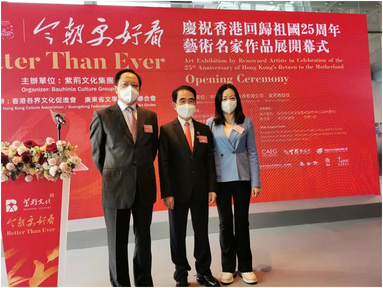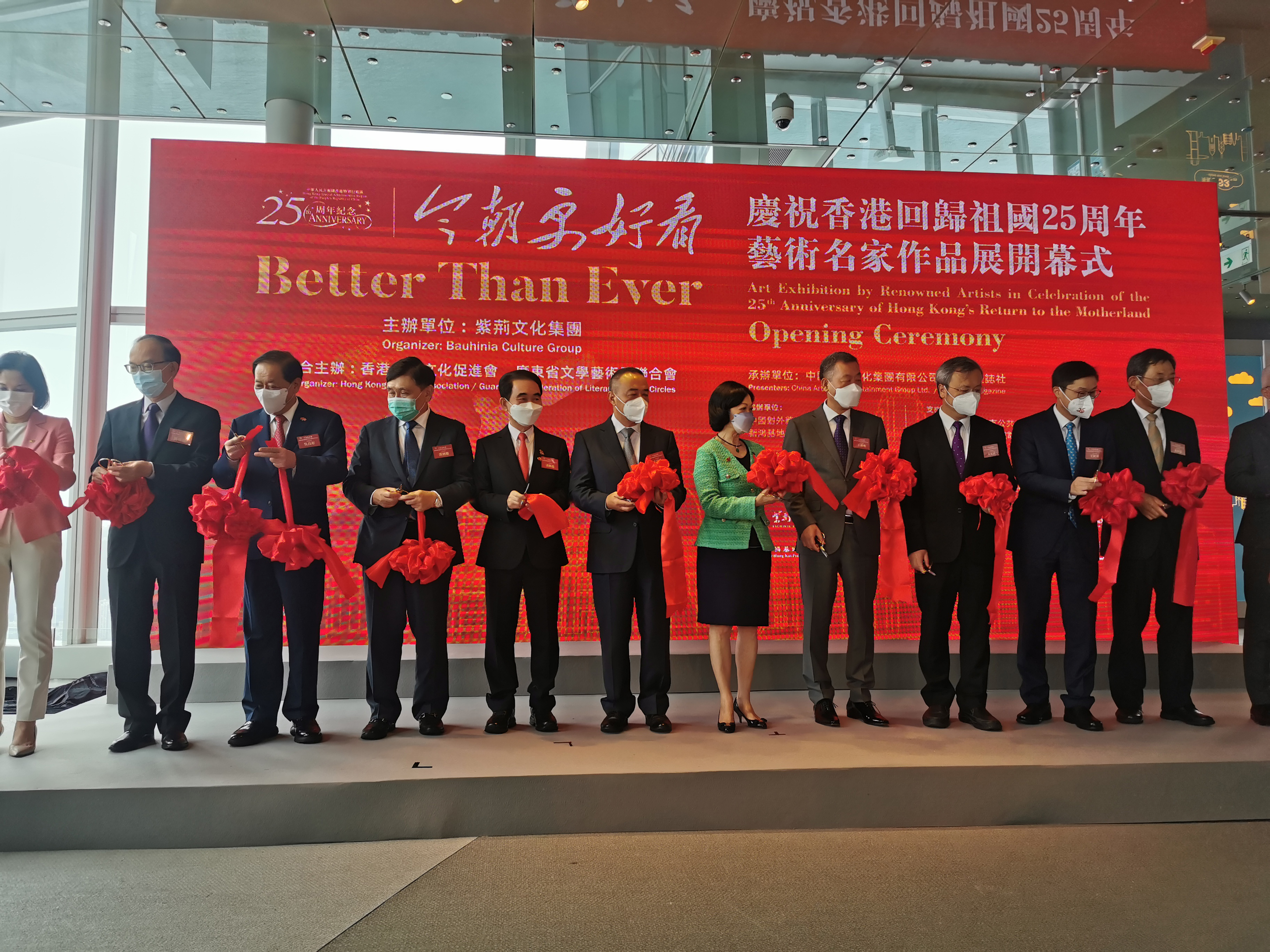 “今朝更好看——庆祝香港回归祖国25周年艺术名家作品展”于7月3日上午在天际100举行开幕式。本次展览由紫荆文化集团有限公司主办,香港各界文化促进会、广东省文联联合主办,中国对外文化集团有限公司、紫荆杂志社承办,中国对外艺术展览有限公司、新鸿基地产慈善基金协办。全国政协委员、香港各界文化促进会主席、海雅集团董事局主席涂辉龙出席开幕式并致辞。