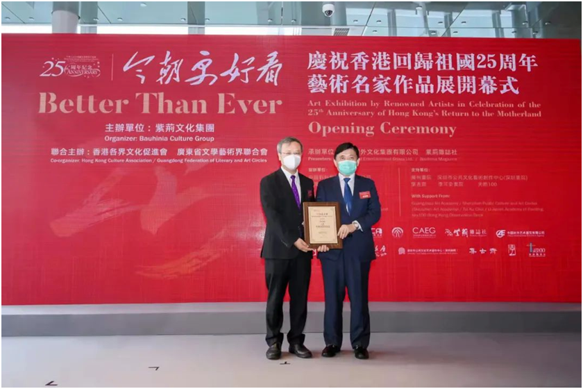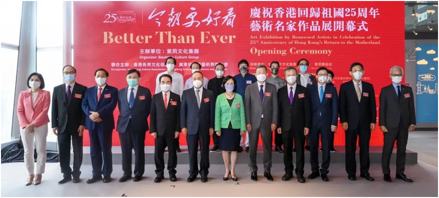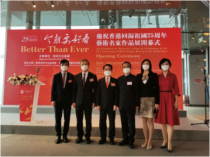 香港特别行政区行政长官李家超在视频致辞中感谢紫荆文化集团在全港同庆的重要时刻举办此次展览给香港市民带来一场丰盛的文化艺术之旅。他表示,香港自回归祖国以来,在国家的重视和支持下,成功落实“一国两制”,在社会和经济发展方面都取得骄人的成就。国家“十四五”规划明确支持香港发展成为中外文化艺术交流中心,为香港的文化事业创造出更广阔的发展空间。在新一届特区政府的架构下新成立了文化体育及旅游局,这不仅将促进文化艺术产业的发展,也可利用旅游业进一步对外推广中华文化,将香港建设成为中外艺术文化之都,提升香港国际地位。