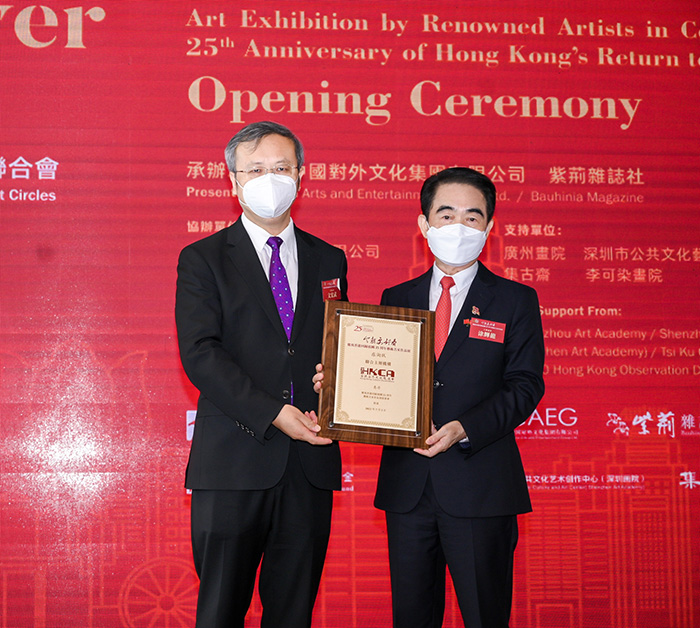 涂辉龙主席在致辞中表示,回归以来,“一国两制” 在香港成功实践,结出累累硕果,谱写出百年伟业的香江篇章。回归二十五载,祖国一直是香港坚强的后盾。这次举办艺术名家作品展,正是香港回归祖国25年,中央馈赠香港的一份厚礼,彰显了中央对香港同胞的关心和对香港未来发展的美好祝福。展览既有二十世纪中国书画巨匠的珍贵典藏作品,又有当代名家力作,充分展现了中国近代和当代艺术精彩多元的面貌和蓬勃生机,堪称名家荟萃、星光璀璨。尤其是展览还特别邀请香港知名画家围绕香港回归后的新发展、新变化,描绘粤港澳大湾区的风土人情,凸显了香港融入国家发展大局的积极作为,充分展现香港的繁荣进步与祖国密不可分,与中华文化一脉相承。希望通过此次展览,香港同胞能够感受中华民族文明之美,探寻中华文化的民族精神,让充满现代活力的香港文化在交流共融中不断增强民族文化自信。