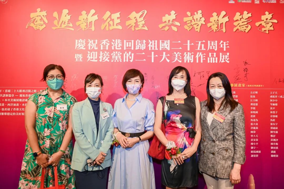 右起:香港各界文化促进会常务副主席马春玲、刘娟,香港各界文化促进会副主席高璐、紫荆杂志社助理总经理崔砚文、香港商报业务总监张蓓在一起