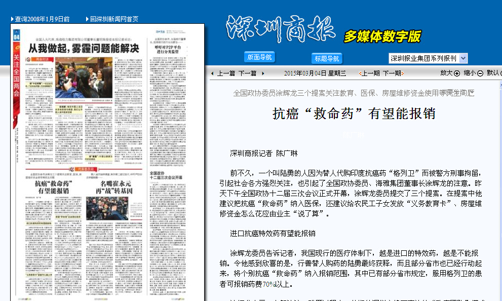 凤凰网:全国政协委员涂辉龙:把抗癌“救命药”纳入医保 2015-03-09
