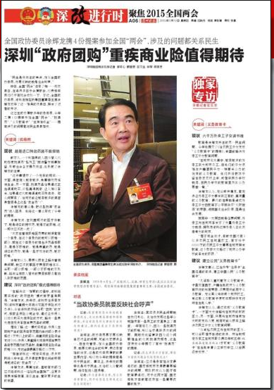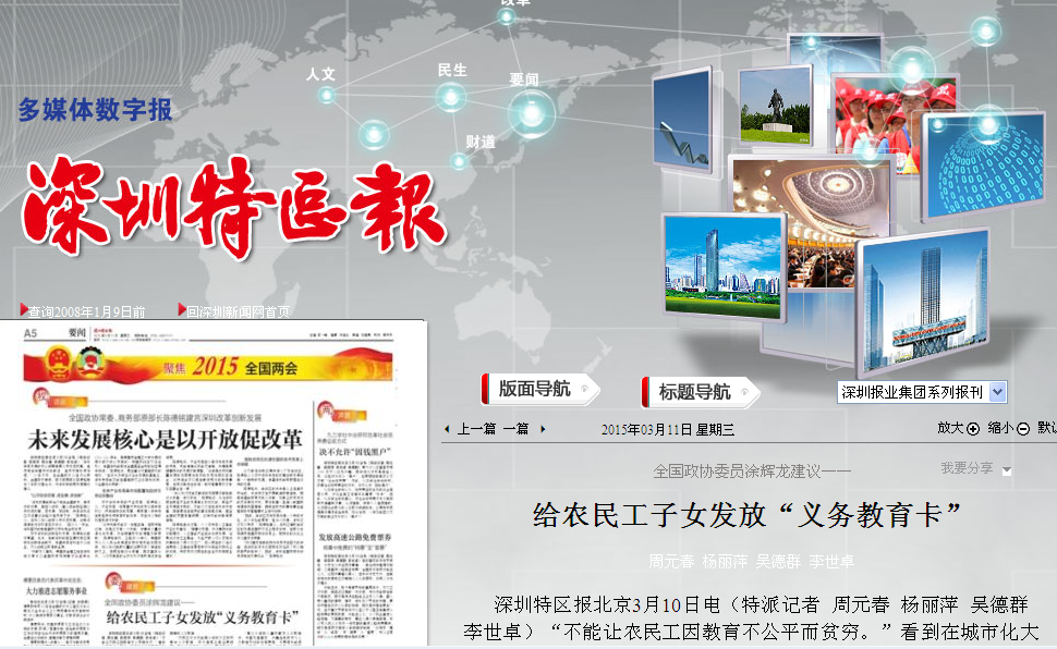 《深圳特区报》:全国政协委员涂辉龙建议——给农民工子女 2015-03-11