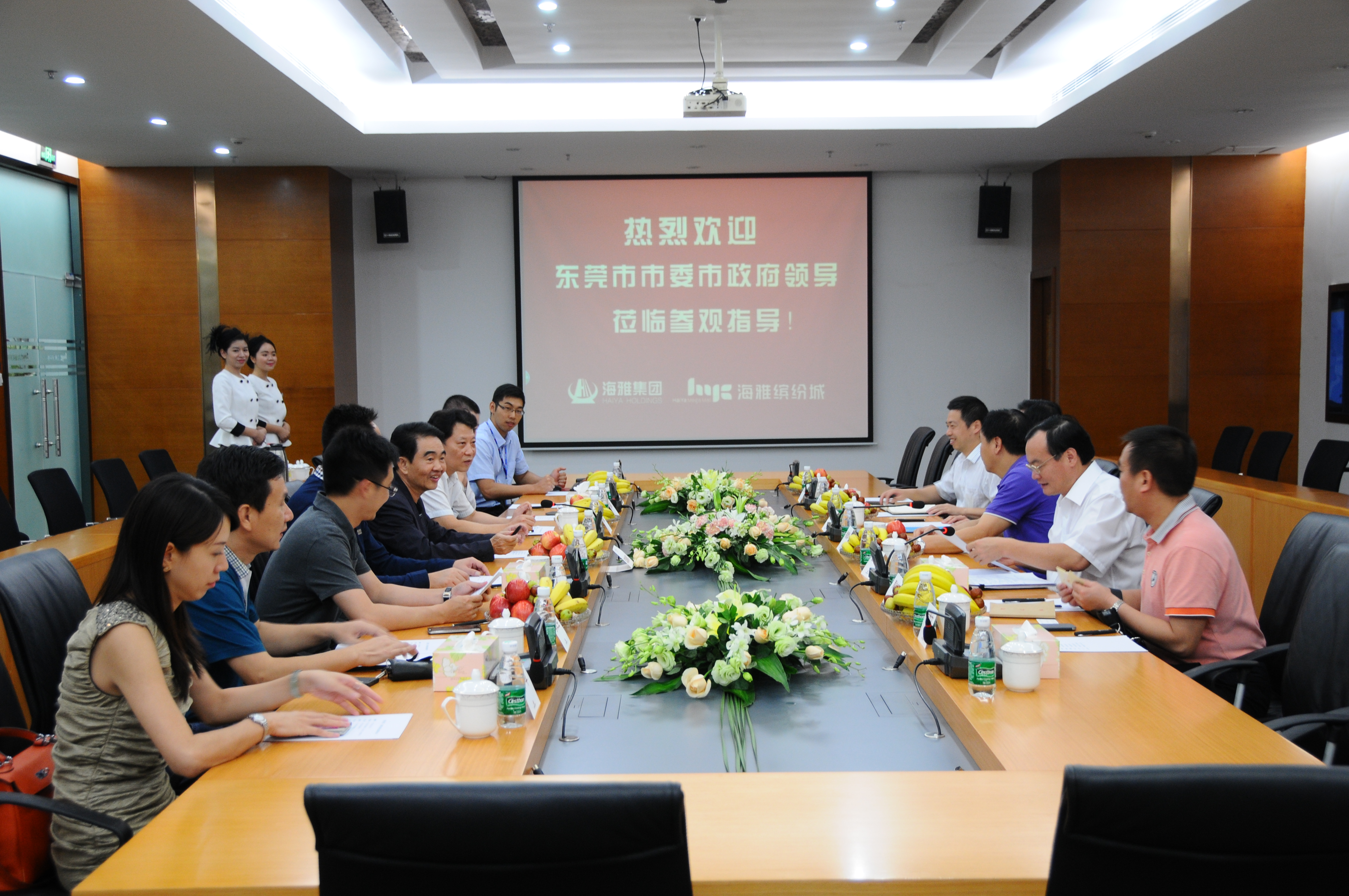 东莞市委书记徐建华、市长袁宝成率队考察海雅集团,海雅集团董事长涂辉龙,常务副总裁范志强,副总裁涂尔帆、张瑞龙、张春琛、李文生,特别助理冯峰陪同考察并与东莞考察团座谈。徐建华书记表示希望双方争取年内就有关合作项目达成共识。[详情]