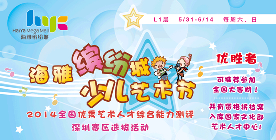由深圳市关爱行动公益基金会、深圳市海雅缤纷城商业有限公司、深圳市翠鸣文化艺术有限公司联合主办的2014全国优秀艺术人才书画优秀作品义卖展览,将于2014年5月31日—6月8日在深圳市宝安区海雅缤纷城一楼中庭举行。